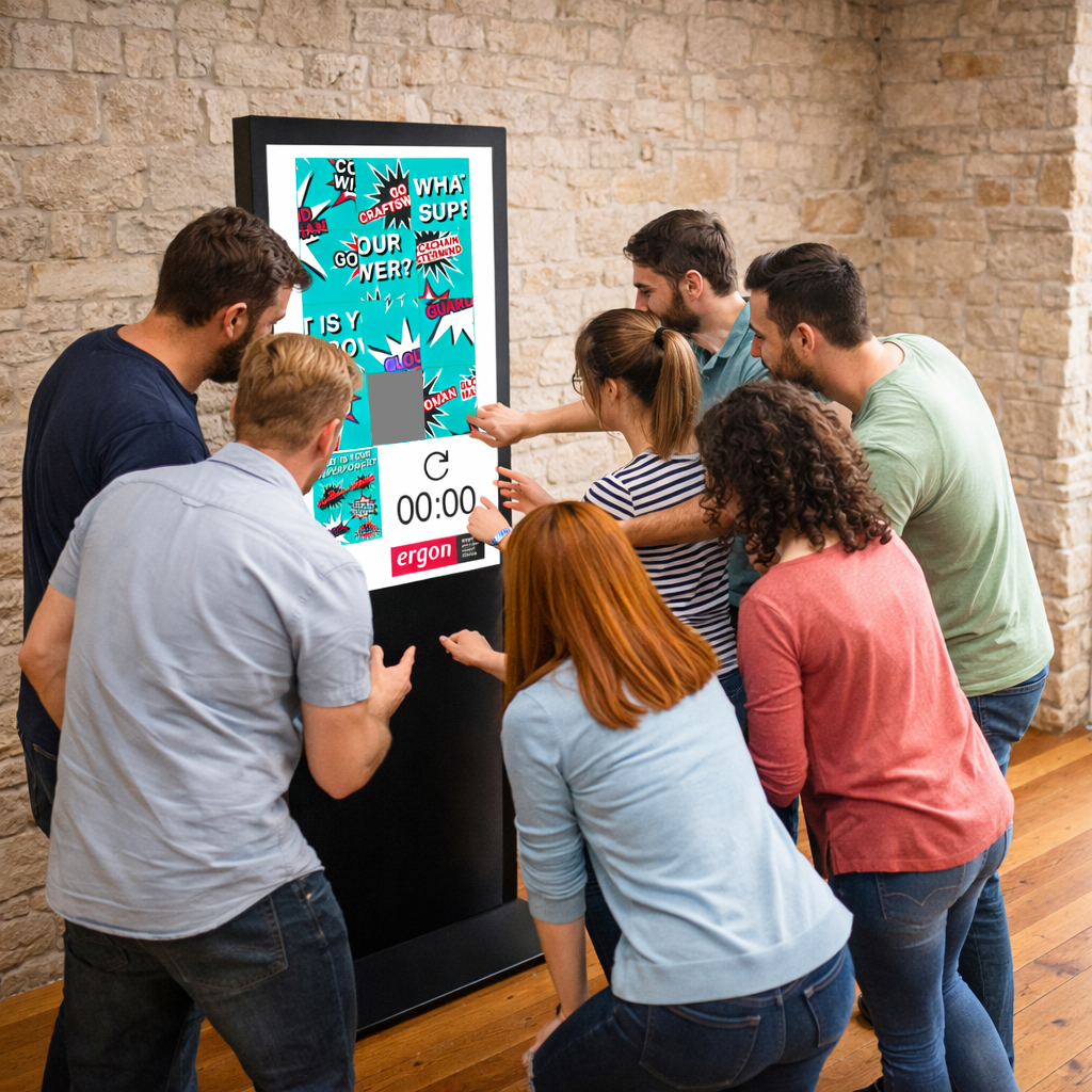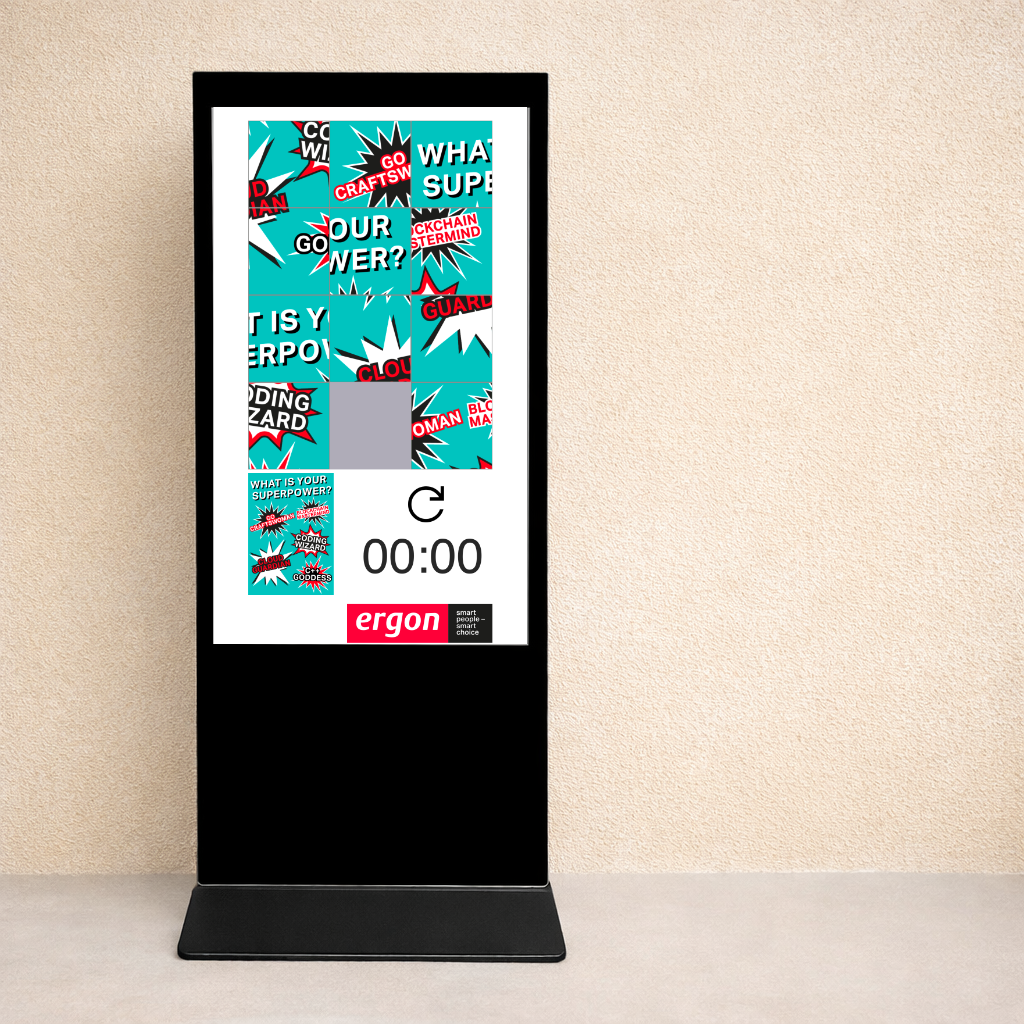 Unser Digital-Schiebepuzzle ist verfügbar mit einen 22-Zoll Touch-Terminals oder 55-Zoll Touch-Kiosksystem. Auf dem jeweiligen Touch-Display wird ein Motiv aufgezeigt, das in mehrere Kacheln unterteilt ist – ein Feld bleibt frei, damit die Kacheln verschoben werden können. Die Gestaltung der Spieloberfläche und das gesamte Branding – Logos, Produktbilder oder Wunschmotive – setzen wir nach Ihren Vorgaben um. Die Aufgabe der Spieler: Die zufällig gemischten Kacheln werden so verschoben, bis das Motiv wieder korrekt zusammengesetzt ist. Zur Orientierung ist das Originalbild während des gesamten Spiels am seitlichen Rand eingeblendet. Dabei wird die die Zeit gestoppt bis zur Lösung und aufgezeigt direkt im Spiel. Bei jedem Neustart werden die Kacheln neu gemischt. Ein besonderes Highlight des 22-Zoll Touch-Terminals: Der Spieler kann die Motive bequem aus einem Bildpool selbst auswählen und den Schwierigkeitsgrad jederzeit über die Anzahl der Kacheln selbst anpassen. Zusätzlich bieten wir für den 22 Zoll Touch-Terminal Bildschirme (50 – 75 Zoll) mit Bodenständer für die Übertragung des Spiels.