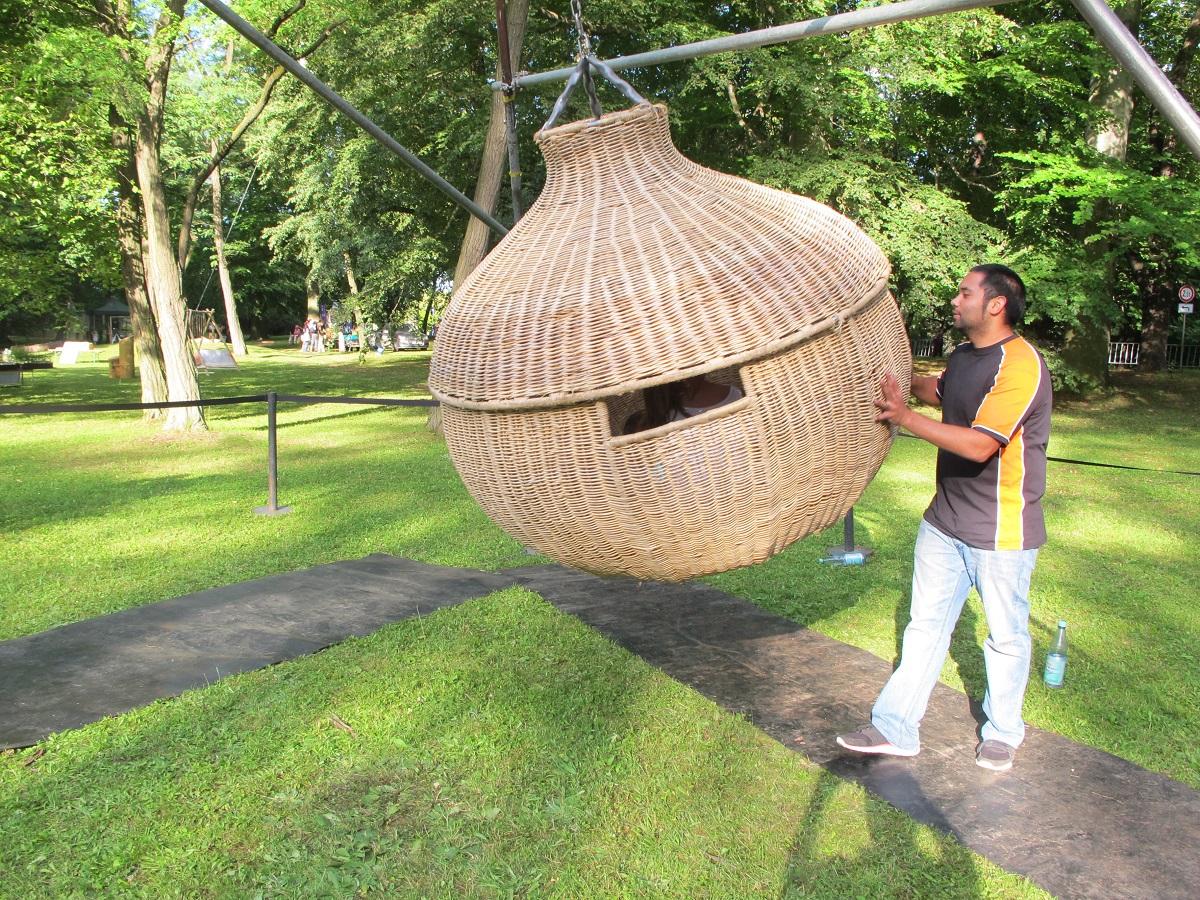 Was von weitem aussieht wie freihängende, überdimensionale Bienenkörbe, sind tatsächlich unsere Weltenschaukeln. Sitzend oder liegend können sich bis zu sechs Kinder schaukeln, drehen und schwingen lassen. Ein einmaliges Highlight – auch für Erwachsene!